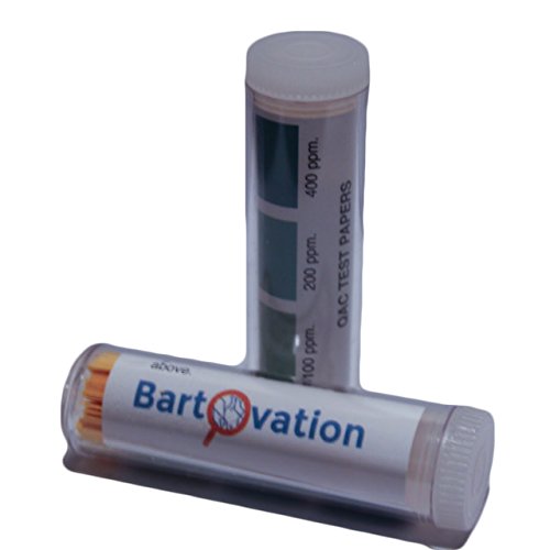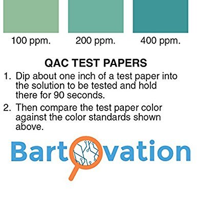 -. Brand : Bartovation -. EAN : 0643845994709 -. Feature : Use with Steramine & other Quaternary Sanitizers! / Strip Length: 2 inches. Test Range: 0-400 ppm. 100 strips/vial / An Economical Way To Meet Health Department Requirement for Restaurants & Bars. / Contains Instructions & Matching Color Chart for 0 - 400 parts per million with 200 parts per million being the concentration specified for sanitizing within every vial for handy access! / Avoid Costly Health Department Fees! -. IsAutographed : 0 -. IsMemorabilia : 0 -. Label : Bartovation -. Manufacturer : Bartovation -. MPN : PBARTLQAC -. NumberOfItems : 1 -. PackageQuantity : 1 -. PartNumber : PBARTLQAC -. ProductGroup : BISS -. ProductTypeName : LAB_SUPPLY -. Publisher : Bartovation -. Studio : Bartovation -. Title : 100 2" PAPER QUAT QAC (quaternary ammonium) TEST STRIPS IN VIAL (100-400 PPM) -. UPC : 643845994709