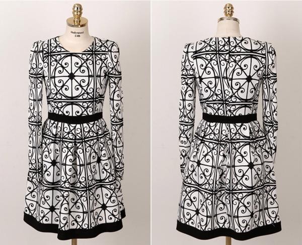 幾何学的デザイン 長袖 モノトーンワンピース 白黒/ XL