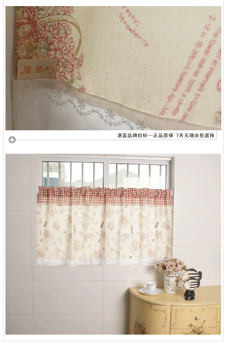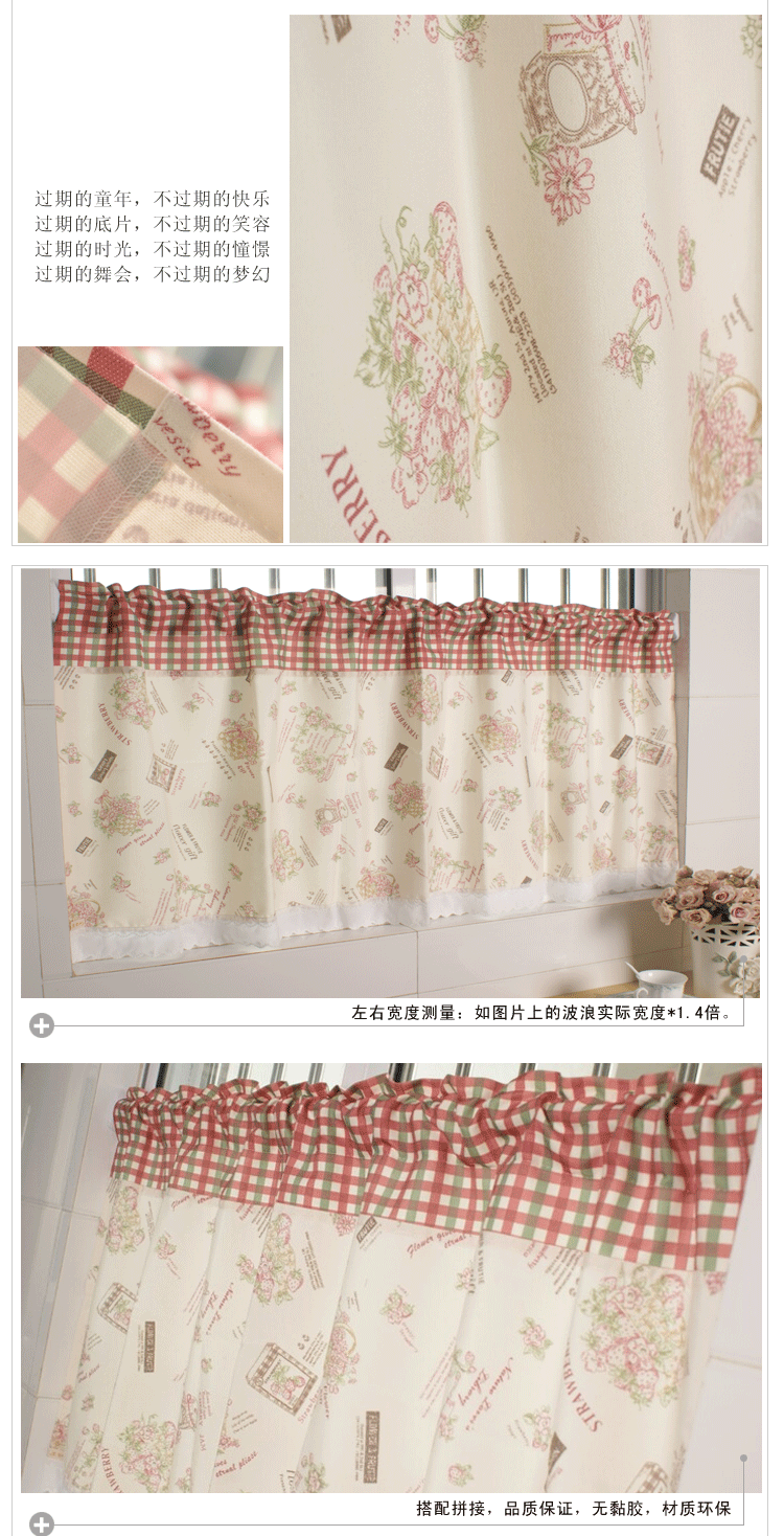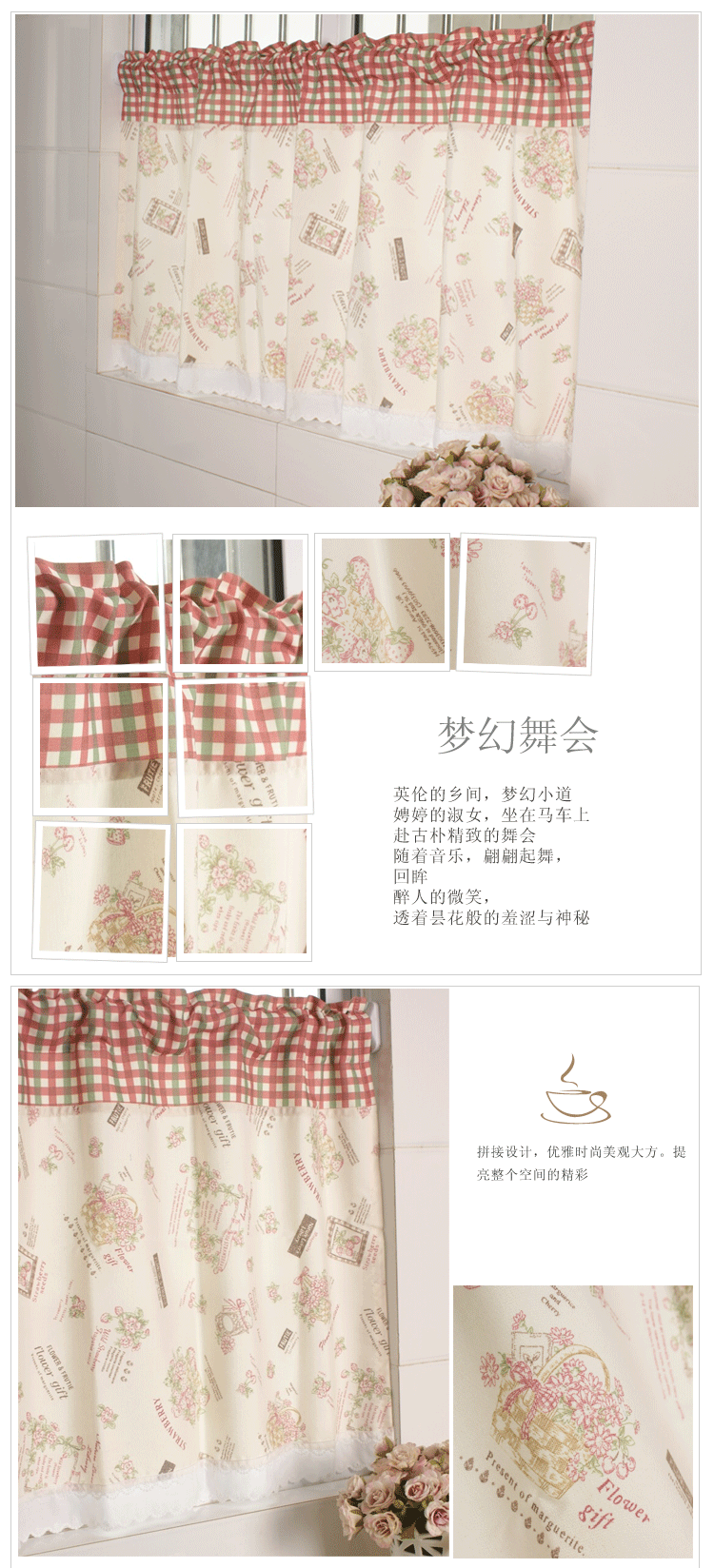 这款帘子创意独特,英伦格子搭配英伦花篮,充满浪漫可爱的气息,配色清新自己然,在家中挂置提亮整个空间的色彩,又别具一格,也适合小朋友的房间哦。优质面料,品质保证,安全环保。用心制作,缝线紧密整齐,无零散线头。环保级活性印染技术,色牢度高,富有层次感。拼接设计,优雅时尚美观大方。提亮整个空间的精彩。