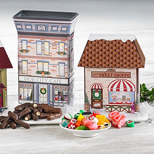 -. Binding : Grocery -. Brand : FIGI'S -. Feature : Figi's Exclusive! / Village shop-shaped tins with embossed accents create a wonderful, collectible display / Each tin includes a Bonus treat / The Brick House brings Chocolate Chip Pecan Cookies; the Victorian has Mint, Cherry, and Raspberry Meltys; the Cafe serves up Dark and Milk Chocolate Pretzel Bites, and the Sweet Shoppe delivers Old-Fashioned Candy Mix -. PackageQuantity : 1 -. ProductGroup : Grocery -. ProductTypeName : GROCERY -. Title : Hub City Collectible Christmas Village Tins & Treats - All 4 Village Tins