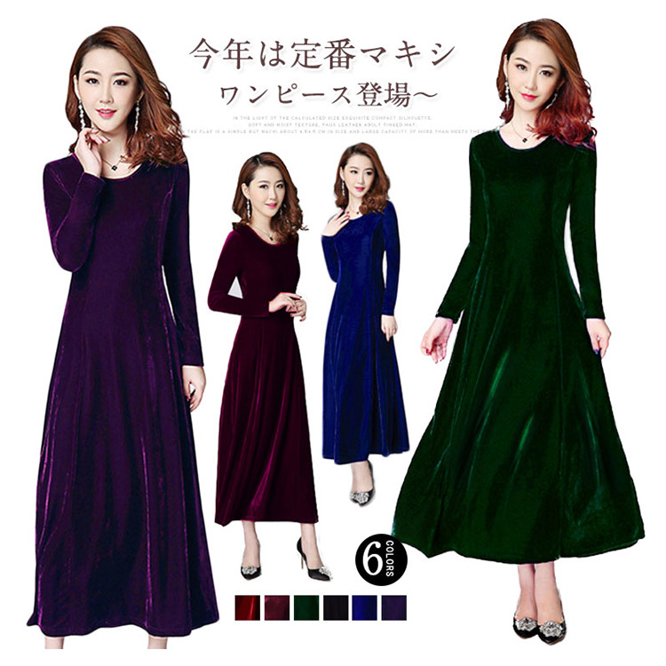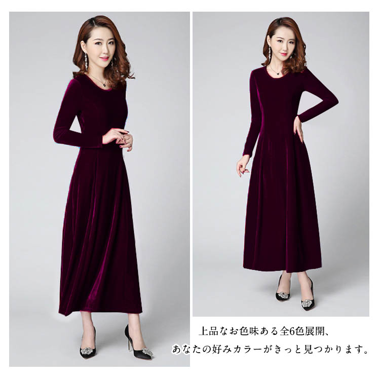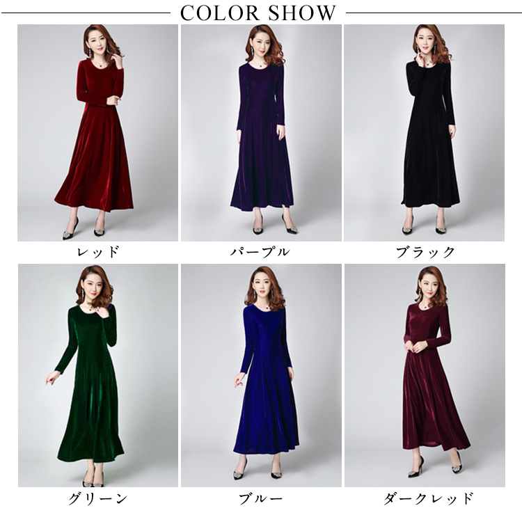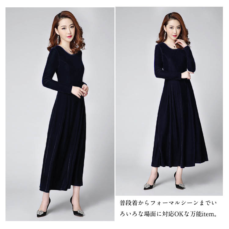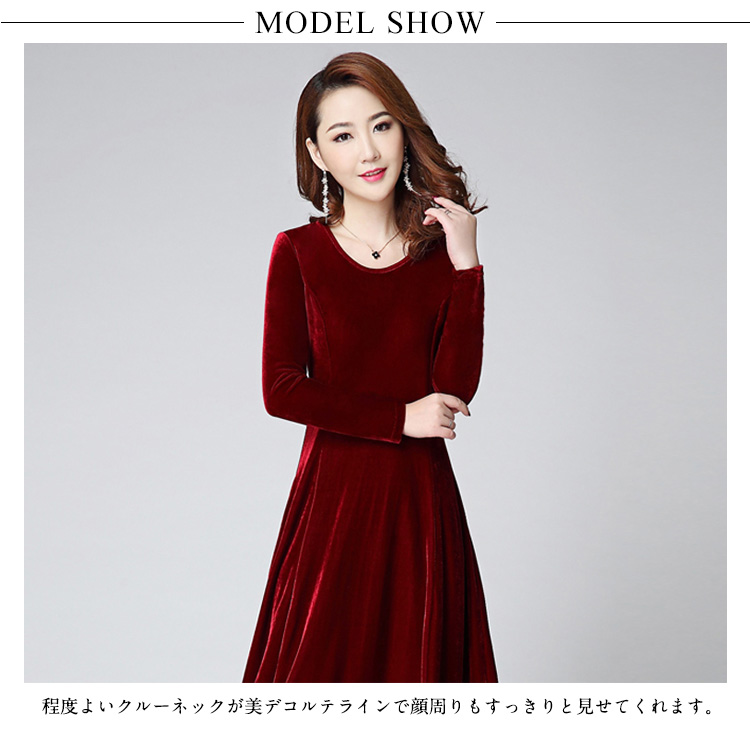 | 今年は定番マキシワンピース登場?程度よいクルーネックが美デコルテラインで顔周りもすっきりと見せてくれます。光沢感ある秋冬らしいベロア素材を使います。ハイウェストデザインは脚を長く見せられます。ウエストからひろがったフレアシルエットは気になるところもカバーしてます。上品なお色味ある全6色展開、あなたの好みカラーがきっと見つかります。普段着からフォーマルシーンまでいろいろな場面に対応OKな万能item。 | |