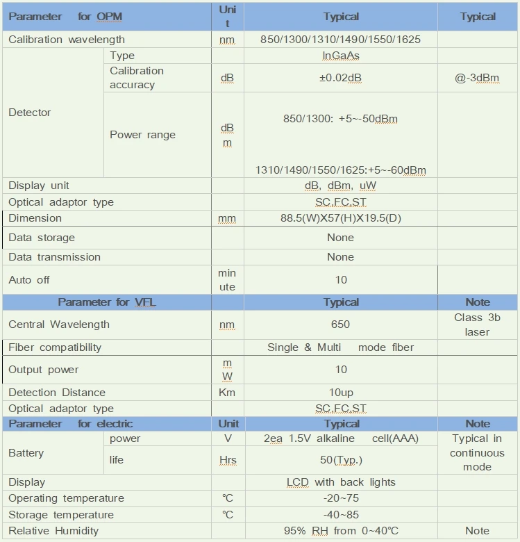 OPM-VFL of Fiberpia integrates the Optical Power Meter and the Visual Fault Locator. The Optical Power meter can measure dBm, dB and uW in the wavelength band of 850,1300,1310,1490,1550 and 1625nm.