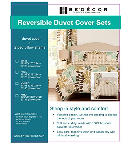 Twin-size? Duvet cover: 69 by 90 inches? Pillow Sham: 20 by 26 inches? Full/Queen size? Duvet cover: 90 by 90 inches? Pillow sham: 20 by 26 inches? King size? Duvet cover: 104 by 90 inches? Pillow sham: 20 by 36 inches?
