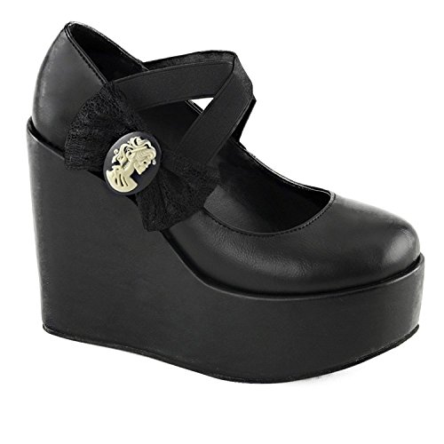 Studio : Pleaser USA Inc Publisher : Pleaser USA Inc Binding : Apparel Product Description Alternative, defiant, and nonconforming enthusiasts need look no further than Demonia for the most cutting-edge, beyond-the-ordinary line of footwear. Its original meaning and connotation of demonic diva is by no means gender exclusive. Demonia not only reflects the alternative lifestyle, it defines it. This Poison 02 Platform Wedge feature criss-cross elastic bands, lace bow and skull lady cameo at outer side. Platform height: 5' (12.5cm). Material: Vegan Leather, Lace. 0