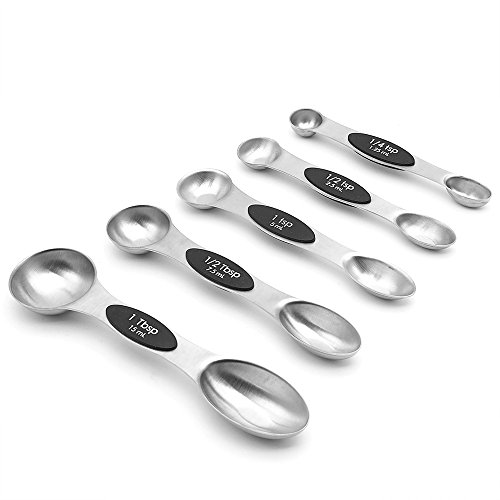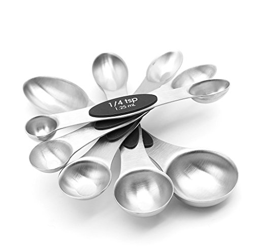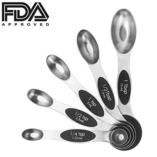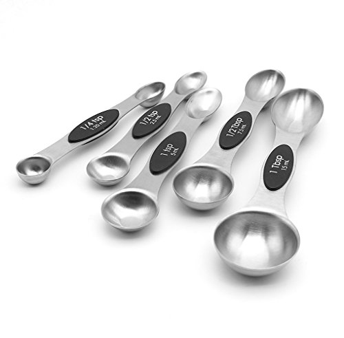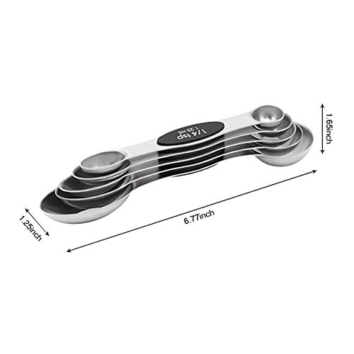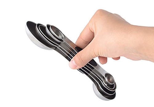 Measuring spoons securing them together when not in use. Each measuring spoon is equipped with two different style spoons, one as a traditional spoon head and the other with a narrow and flat head allowing ease of access in small boxes and rests securely on the counter with the flat base. When finished using the spoons, place directly in the dishwasher for an easy and effortless clean up. Baking is never made easier with the correct kitchen tools.