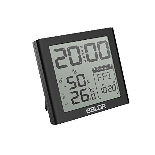 Desk Alarm Clocks with Snooze Date Calendar Functions and Indoor Thermometer Hygrometer, Portable Travel Clocks Temperature Humidity Meter Max/Min Record White Backlight (Black)