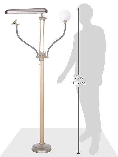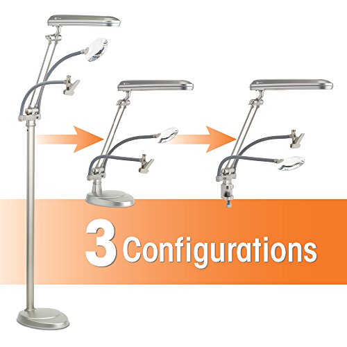 Crafters, tinkerers, and students alike will love the ingenuity of OttLite's K94CP3 3-in-1 floor lamp. At once a floor, table, and clamp lamp, the versatile fixture offers multiple configurations for perfect placement at a desk, over a corner chair, at a workbench, and beyond. The unit's high-contrast, 508 Natural Sunlight Illumination allows for viewing fine print, small details, and other frequently missed items with ease, as well as ensuring exceptional color accuracy--a welcome detail for artists, painters, woodworkers, and jewelry makers. Better yet, its energy-efficient 24-watt tube-style bulb (Type C, included) provides up to 10,000 hours of low heat, low-glare illumination, with a broad, hinged shade that channels and directs light precisely where needed. Additional highlights include a 5X optical-grade magnifier with an adjustable gooseneck for hands-free use; an oversized, gooseneck-mounted clip that acts as an extra arm to hold snapshots, instruction manuals, patterns, and other necessities; a sturdy base and slender pole that leave a small footprint in a workshop, crafting room, or bedroom; and a sleek, champagne-colored finish that tastefully complements a host of settings. Accompanied by included hardware for converting the lamp to meet the needs of any space, the 3-in-1 floor lamp measures 45 inches at its minimum height and 63-3/4 inches at its maximum height, and its base measures 12 inches wide by 8 inches deep.