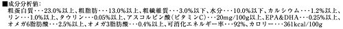 素材構成:粗蛋白質…23%以上、粗脂肪…13%以上、粗繊維質…3%以下、水分…10%以下、カルシウム…1.2%以上、リン…1%以上、タウリン…0.05%以上、アスコルビン酸(ビタミンC)…20mg/100g以上、EPA&DHA…0.25%以上、オメガ3…0.4%以上、オメガ6…2.5%以上