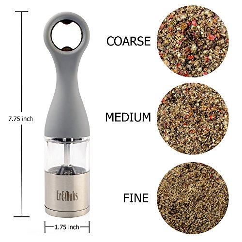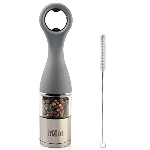 Pepper Mill and Bottle Opener, Salt or Pepper Grinder, Brushed Stainless Steel with Ceramic Grinding Mechanism, Salt and Pepper Shakers with Adjustable Coarseness Setting, Cleaning Brush By Er&Maks