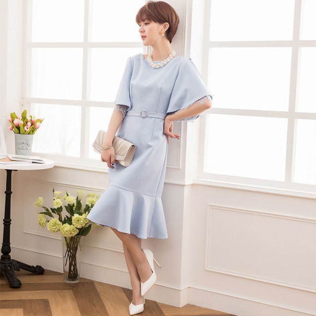 二の腕を隠しながら肌を覗かせて大人シックにお召しいただけます♪ェミニンなマーメイドラインで女性らしい曲線美を引き立たせてくれます。ラインストーン付共布ベルトでウエストマーク、脚長効果抜群です◎