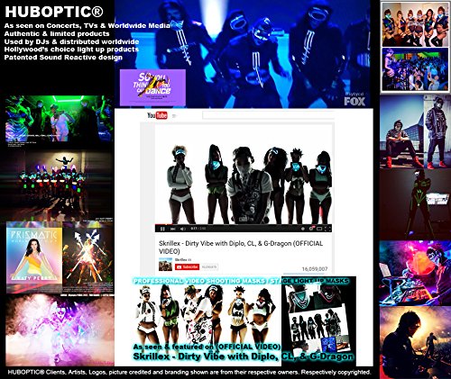 HUBOPTIC® FLAREOFF JP1 Mask - BLUE color mask or UPON REQUEST Choose your favorite color when you purchase the mask best within 12hrs. NOTE: (PURPLE COLOR IS SOLD OUT) If different color is not selected within 12hrs we will process your order with standard/original color to avoid shipping delay. Style: Noise Sensitive lighting (Sound Reactive) / Batteries (AAA) not included. 100% view through even at night (dark) - mask being used by DJs & Professionals worldwide! CHECK OUR CUSTOMERS PICs & VIDEOS at https://www.facebook.com/pages/JorgePongcom/153507868015242 or this Product video can be seen at: http://www.youtube.com/user/jorgepong/videos Product designed for professionals • for stage use only • not waterproof • 100% hand-crafted. Manufacturers warranty protected • CE and Rohs certified components • Assembled in USA • Authentic product and HUBOPTIC® patentedFeature