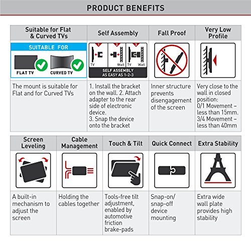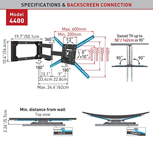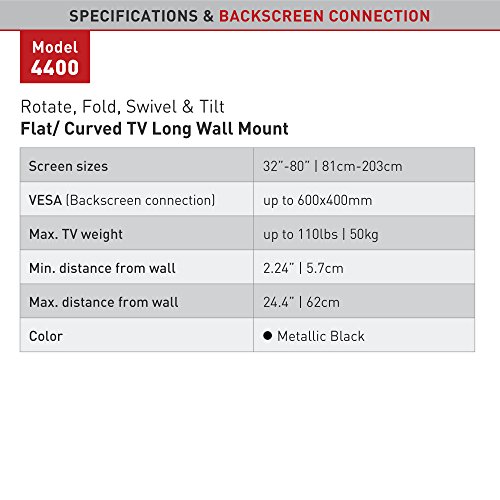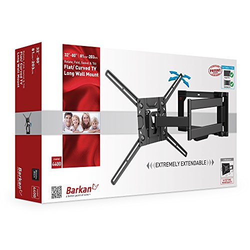 -. Binding : Electronics -. Brand : Barkan -. Color : Metallic black -. EAN : 0818212001056 -. Feature : Patented mechanism to fit both flat and curved screens / Extra wide wall plate for extra stability / Quick connection mechanism enables easy connection and disconnection of the screen / Fall proof Inner structure prevents disengagement of the screen. / Compatibility to larger screen size applies for TVs with weight capacity and VESA pattern specified below. -. Label : Barkan USA Inc -. Manufacturer : Barkan USA Inc -. Model : 4400.B -. MPN : 4400.B -. PackageQuantity : 1 -. PartNumber : 4400.B -. ProductGroup : Home Theater -. ProductTypeName : AV_FURNITURE -. Publisher : Barkan USA Inc -. Size : 80.0 -. Studio : Barkan USA Inc -. Title : Barkan Full Motion Curved/Flat TV Wall Mount for 32" -80" screens up to 110 lbs, Metallic black (4400.B) -. UPC : 818212001056 -. Warranty : Lifetime