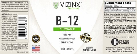 B-12 10,000 MCG Cherry Flavored 100 Tablets supports the healthy functioning of brains cells and nerve tissue. Vitamin B12 is essential for the production of red blood cells, which carry oxygen throughout the body. Supports Heart Health, Metabolism, And Central Nervous System Provides Energy, Concentration, And Mental Clarity Promotes Healthy Levels Of Homocysteine Improves Athletic Performance Non GMO Delicious Cherry Flavored Chewable tablets SUGGESTED USE: As a dietary supplement, take one (1) tablet daily. For best results, allow tablet to dissolve beneath the tongue and swallow.Feature