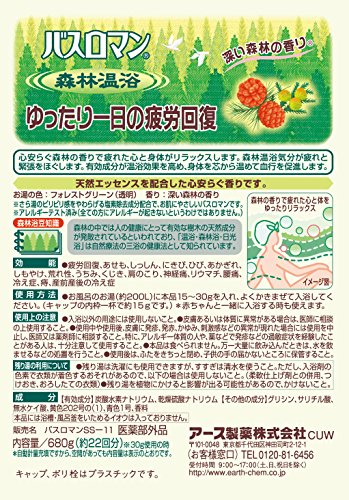 -. Binding : Health and Beauty -. Brand : BATHROMAN -. EAN : 4901080536112 -. Feature : Minus Ion veil wraps the whole body to keep it warm long after bathing. / Helps ease shoulder ache, back ache, cold and physical fatigue. / Sodium sulfate increases blood circulation, raises the skin and body temperature to keep you warmer longer. / Lightly fragranced with calming deep forest aroma. / Made in and imported from Japan. Includes English ingredients and usage instructions. -. Label : EARTH -. Manufacturer : EARTH -. Model : 4901080536112 -. MPN : 77607 -. PackageQuantity : 1 -. PartNumber : 77607 -. ProductGroup : Beauty -. ProductTypeName : HEALTH_PERSONAL_CARE -. Publisher : EARTH -. Studio : EARTH -. Title : Bath Roman Natural SkinCare "Forest" Japanese Bath Salts - 680g