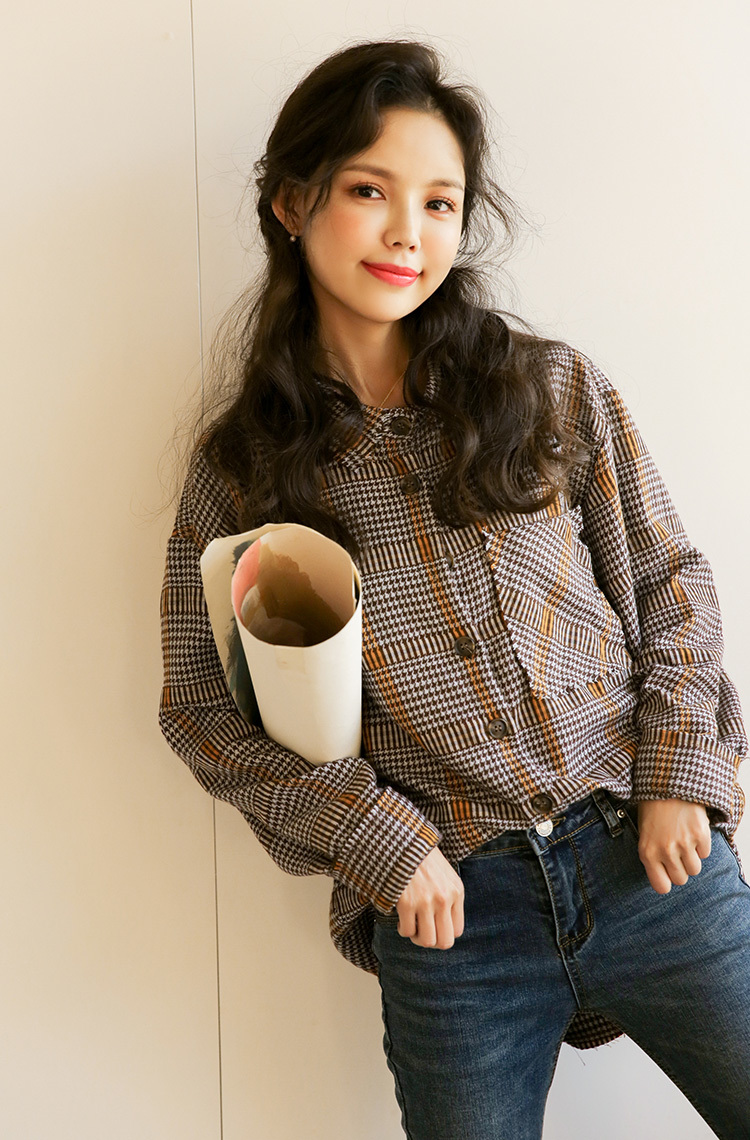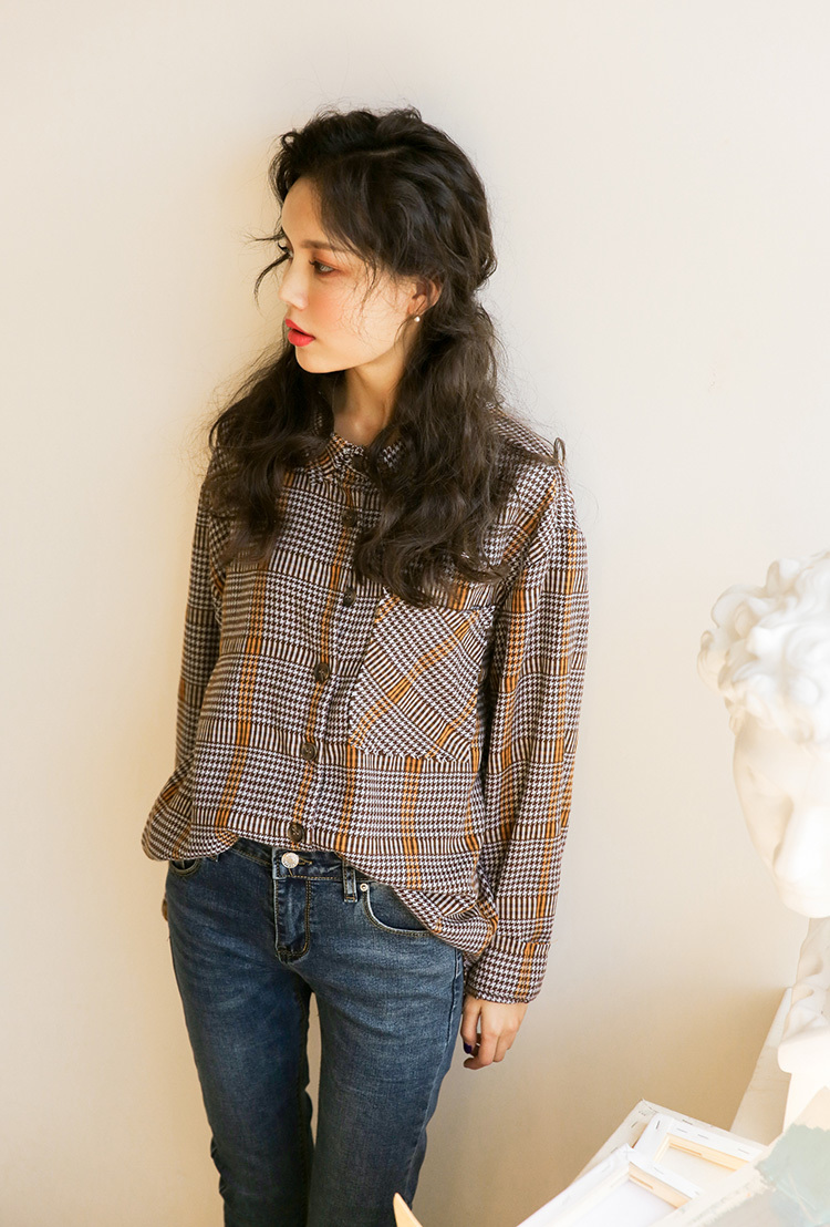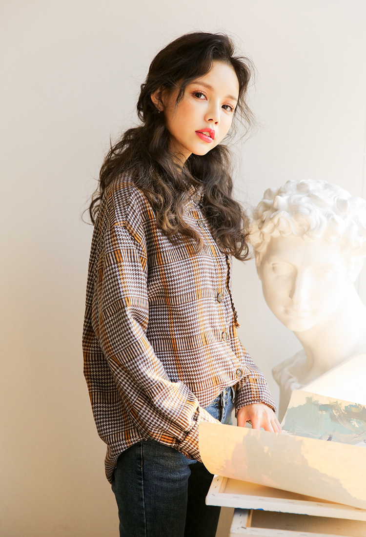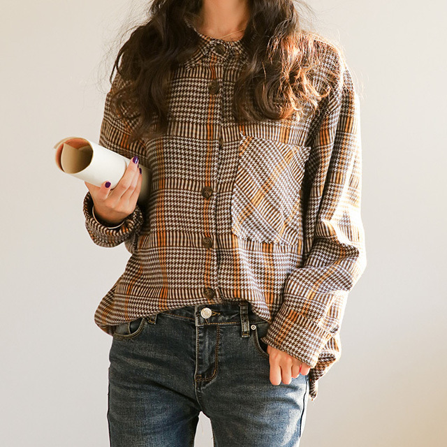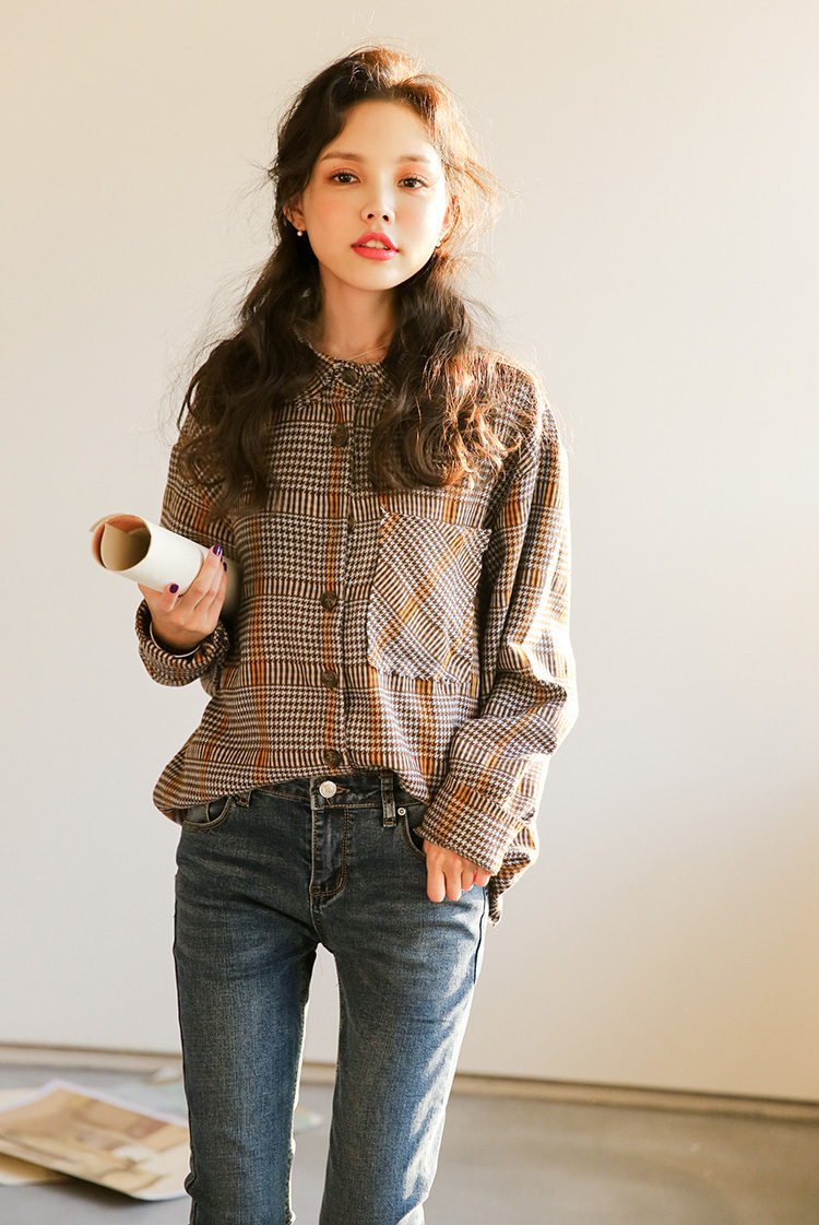 落ち着いたカラーが大人っぽくレトロな雰囲気の長袖チェックシャツです。