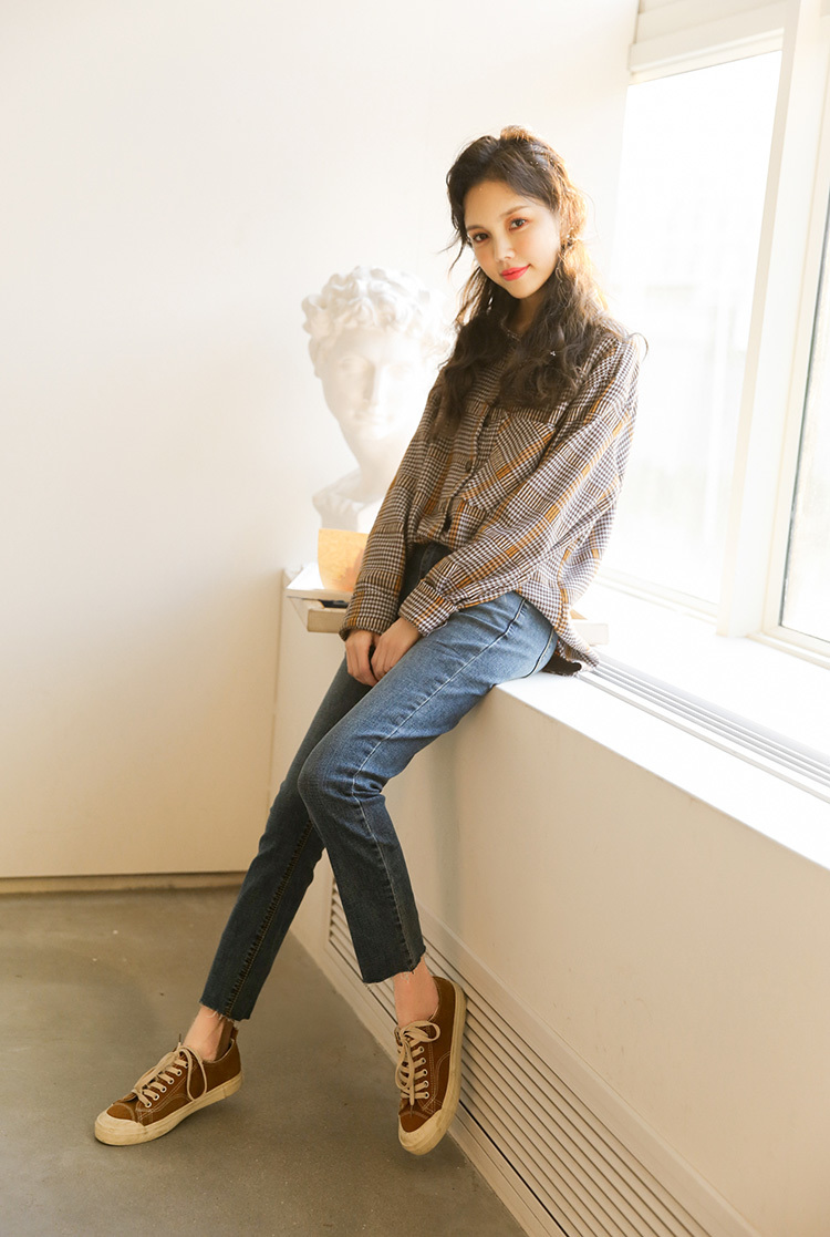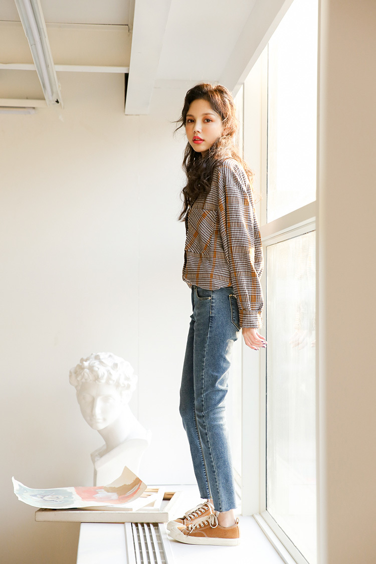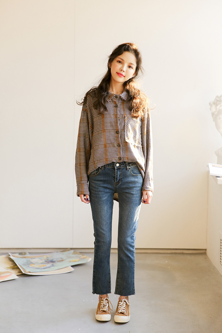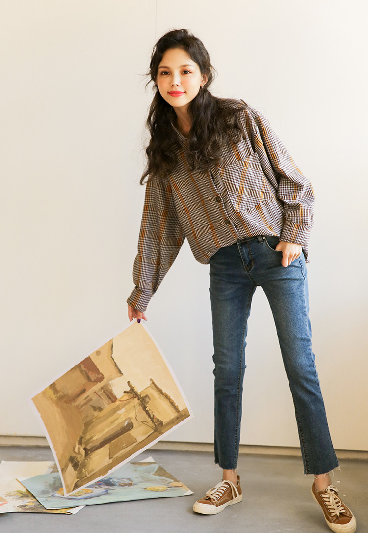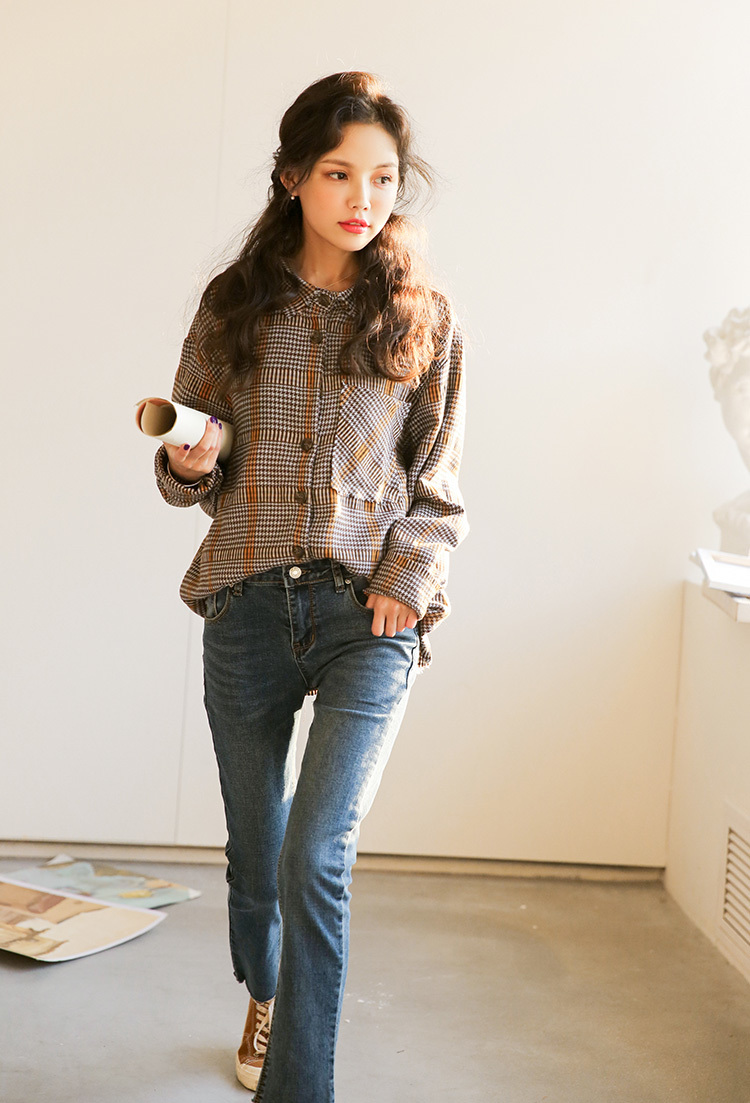 落ち着いたカラーが大人っぽくレトロな雰囲気の長袖チェックシャツです。
