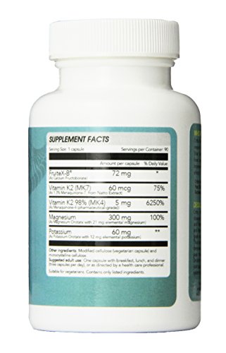 -. Feature : Vitamin K2 MK4 (Menaquinone-4) & Vitamin K2 MK7 (Menaquinone-7) present in therapeutic dosages / Contains highly bioavailable Magnesium Orotate and Potassium Orotate per Dr. Hans Nieper's research / Supports healthy calcium metabolism, bone health, & blood pressure levels; anti-calcification / Contains Calcium Fructoborate (Fruitex-B), a highly bioavailable source of Boron / Gluten-free, Vegan-friendly & Non-GMO. Hypoallergenic, contains absolutely no artificial fillers.