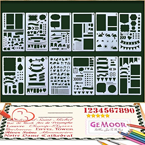 GeMoor 12 Pcs Bullet Journal Stencil Set Plastic Planner DIY Durable Drawing Template for Notebook Diary Scrapbook Craft Projects 4 x 7 Inch
