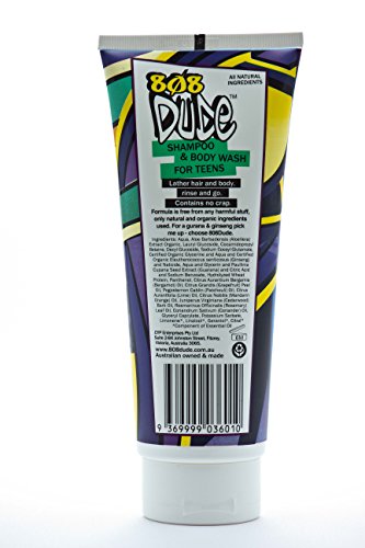 -. Binding : Misc. -. Brand : 808Dude -. EAN : 9369999036010 -. Feature : 100% natural, contains organic ingredients, no animal testing, vegan. / Quick easy to use solution for teens on the go. / Organic Ginseng and Guarana combine to condition the skin and hair. / Essential patchouli and rosemary oils combine to improve memory and ease anxiety. / Australia's best selling natural teen personal care range. -. IsAdultProduct : 0 -. Label : Australian -. Manufacturer : Australian -. MPN : B730 -. PackageQuantity : 1 -. PartNumber : B730 -. ProductGroup : Beauty -. ProductTypeName : BEAUTY -. Publisher : Australian -. Studio : Australian -. Title : 808Dude Shampoo and Body Wash for Teens