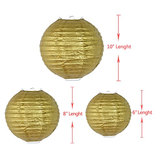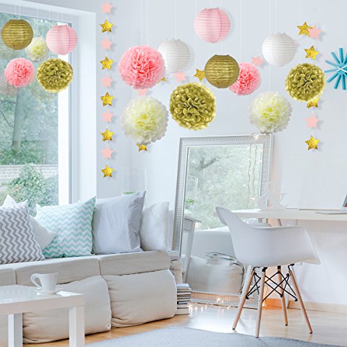 - ★SIZE & COLOR - pompom decoration have 3 sizes: 3 * 6”, 3 * 8”, 3 * 10” in 3 different colors: ivory, gold and pink. Paper lanterns: 2 * 6” in ivory, 2 * 8” in gold, 2 * 10” in pink. 6.5 feet star party garland: diameter is 2* 4” in pink, gold glitter mixed color