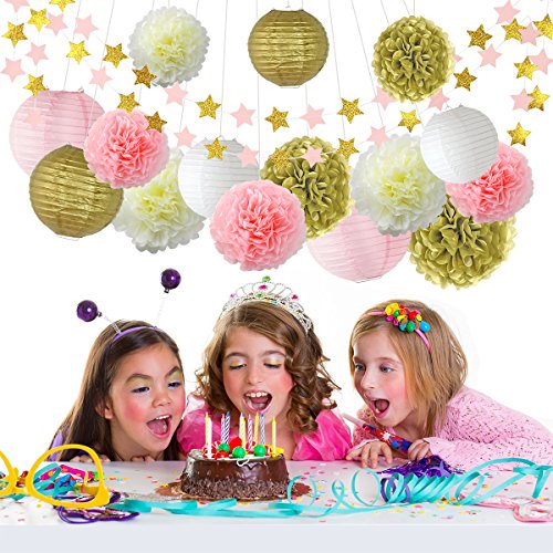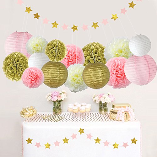 - ★DECORATION KIT INCLUDING – 63pcs party decoration includes 9 pcs tissue paper flowers in 3 sizes and 6 pcs paper lanterns. It also contained 6.5 feet star paper garland with 24 pcs garland paper star,totally 2 pack (pink gold). paper tissue flowers set will light your party and make high impact. Perfect for desert tables Backdrops and overall party space