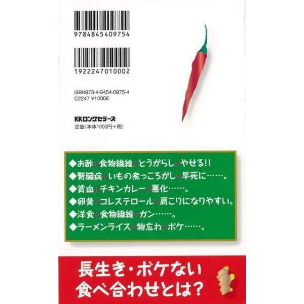 【商品説明】 定価(税込み):1,080円 値引き:10% OFF 「食べ合わせ」の第一人者が教える!! お酢+食物繊維+とうがらし=やせる/卵黄+コレステロール=肩こりになりやすい/仕事のしすぎ+もやしラーメン=ストレスがたまりやすい/……などなど公式を挙げ、具体的で分かりやすい「食べ合わせ」での解決法を解説。早死にせず、長生き・ボケない食べ合わせとは? バーゲンブック 新品 特価 格安 ビューティー&ヘルス 健康法 長寿 健康 テロ ビューティー ヘルス | |
