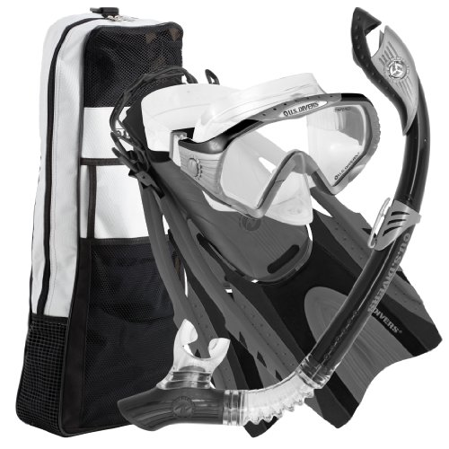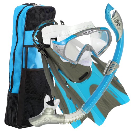 1-Window purge mask with easy-to-adjust buckles, submersible snorkel with silicone mouthpiece flex and purge, Pivot-flex technology fin with comfo strap, Travel Bag Packaging