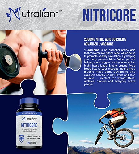 NITRICORE L ARGININE NITRIC OXIDE SUPPLEMENT FOR MEN - THE MOST EFFECTIVE 2,680mg FORMULA. Experience the Extra Strength benefits of our potent L Arginine complex that contains two forms of Arginine: L-Arginine & Arginine Alpha Ketoglutrate (AKG), combined with L-Citrulline, a precursor to Nitric Oxide production, Beta Alanine, the building block for carnosine (a powerful precursor in generating Nitric Oxide), Niacin and Calcium, for energy production. Combining three strong NO synthases with Citrulline for the ultimate synergistic blend, our superior L Arginine formula is designed to help boost Nitric Oxide levels, energy, stamina and balanced hormone levels, which will help promote peak athletic performance and build lean body mass. NUTRALIANT'S L Arginine capsules contain no artificial ingredients or preservatives, only the most potent all-natural ingredients available. So when you open your bottle of NITRICORE, know that it is only the highest quality ingredients you are giving your body.