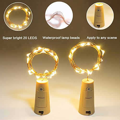-. Feature : GREAT WORKING -- 1Meter /40Inch fine copper wire with 20 pieces super bright warm white string LED lights really help you create romantic and peaceful atmosphere after decoration. The cork shape lights are perfectly suitable for Wine Bottles, Glass Bottles, Soda Bottles, DIY Whisky Bottles or other bottles. / CONVENIENT TO USE -- Just press the ON/OFF button to switch the lights.Each cork light has 3 pieces batteries that has already been installed.Package include 10pcs extra batteries and 1 screwdriver to extend the service life. / WIDELY USED -- The copper wire string lights are super easy for you to design and DIY any shapes. Perfect for Party Decoration, Wedding, BBQ, Halloween, Christmas, Square, Garden, Indoor or Outdoor Decoration. The lights set could be one exquisite gift for your family, children or friends. / SAFE & HEALTHY -- Made of top quality fine and bending copper wire.Has CE and RoHS certification. Reliable, eco-friendly and energy saving. / EXCELLENT AFTER-SALE SERVICE -- Please freely contact us to get immediately reply within 24 hours if you have any questions about the product you received.We provide 90 days return or money-back guarantee and lifelong maintenance for every our customers to make sure they are happy about the purchasing from us.