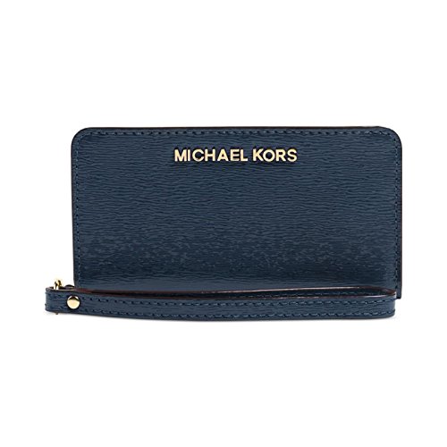 -. Feature : MICHAEL Jet Set Travel Slim Tech Wristlet navy patent leather. Wrist strap. Inside, compartment for phone; card and ID slots. 3"H x 7"W x 1"D. Imported.