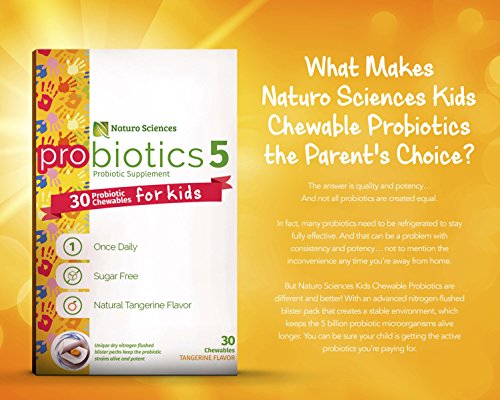 -. Binding : Health and Beauty -. Brand : Naturo Sciences -. Feature : HAPPY TUMMIES: Probiotics can be a huge help when your little one has diarrhea or other tummy upsets, including those associated with the use of antibiotics. Naturo Sciences Kids Chewable Probiotic helps restore the natural balance in your child's digestive tract, which is crucial to helping him or her get over painful tummy troubles. / HEALTHY DIGESTIVE & IMMUNE SYSTEMS: We all want to keep our children strong and healthy, and the key probiotics in this kid-friendly formula can be a great immune-system-booster... helping to maintain a healthy balance of good bacteria in the gut, keeping your child's digestive system happy and supporting a healthy immune function. / KIDS LOVE THE GREAT TASTE: Easy to chew. Sugar free. Drama free... and kids love the great natural tangerine flavor of Naturo Sciences Kids Chewable Probiotics. Have an especially picky little eater? This once-a-day chewable can be easily hidden in snacks or crushed and mixed with cold foods. / PARENTS LOVE THE EFFECTIVENESS: Naturo Sciences Kids Chewable Probiotics contain 8 kid-friendly probiotic strains with 5 billion live cultures. And to ensure the delivery of active probiotics to their target, Naturo Sciences Kids Chewable Probiotics come in distinctive blister foil packs that use a special form of dry nitrogen for guaranteed fresh cultures! / Kids Chewable Probiotic Supplement; 30 Probiotic Chewables for Children in Dry Nitrogen Flushed Blister Packs, Guaranteed Live Cultures, 30 Count, Once Daily, Sugar Free, Natural Tangerine Flavor -. IsAdultProduct : 0 -. Label : Naturo Sciences -. LegalDisclaimer : *These statements have not been evaluated by the Food and Drug Administration. This product is not intended to diagnose, treat, cure or prevent any disease. Actual product packaging and materials may contain more and different information than what is shown on our website. We recommend that you do not rely solely on the information presented and that you always read labels, warnings, and directions before using or consuming a product. Please see our full disclaimer below. -. Manufacturer : Naturo Sciences -. MPN : NS-KDSPROBI -. PackageQuantity : 30 -. PartNumber : NS-KDSPROBI -. ProductGroup : Health and Beauty -. ProductTypeName : HEALTH_PERSONAL_CARE -. Publisher : Naturo Sciences -. Studio : Naturo Sciences -. Title : Naturo Sciences, Childrens Chewable Probiotic, Kids Digestive Immune Defense Probiotics, Nitrogen Filled Blister Packs for Best Product Freshness, 30 Once Daily Sugar Free Natural Tangerine Favor
