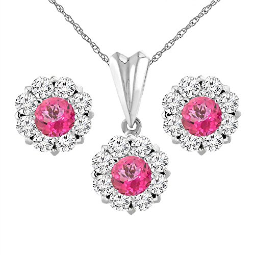 -. Title : 14K White Gold Natural Pink Topaz Earrings and Pendant Set with Diamond Halo Round 6 mm