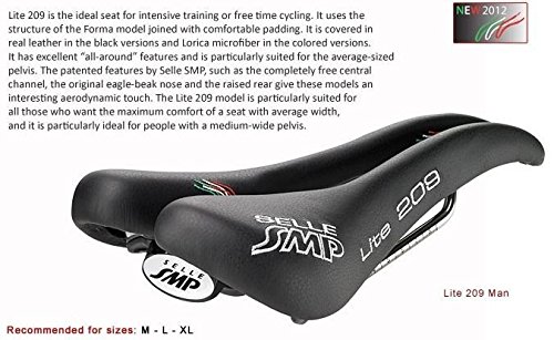Studio : Selle SMP Publisher : Selle SMP Binding : Misc. Product Description Lite 209 is the ideal seat for intensive training or free time cycling. It uses the structure of the Forma model joined with comfortable padding. It is covered in real leather in the black versions and Lorica microfiber in the colored versions. It has excellent "all-around" features and is particularly suited for the average-sized pelvis. The patented features by Selle SMP, such as the completely free central channel, the original eagle-beak nose and the raised rear give these models an interesting aerodynamic touch. The Lite 209 model is particularly suited for all those who want the maximum comfort of a seat with average width, and it is particularly ideal for people with a medium-wide pelvis. 0