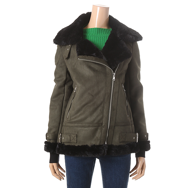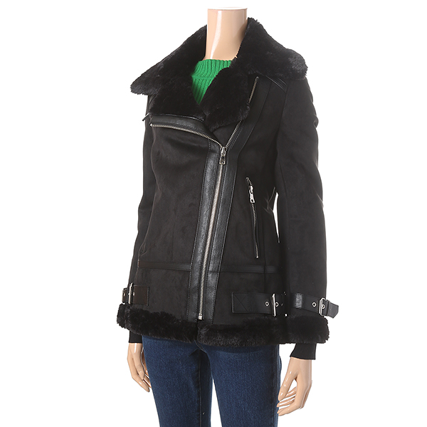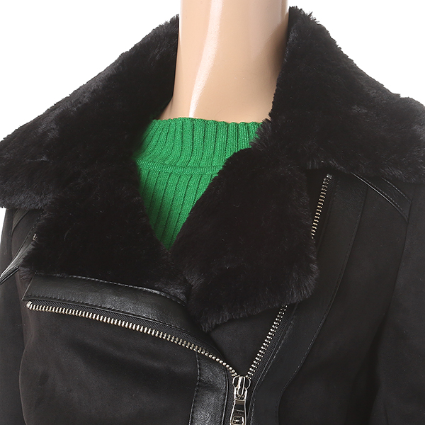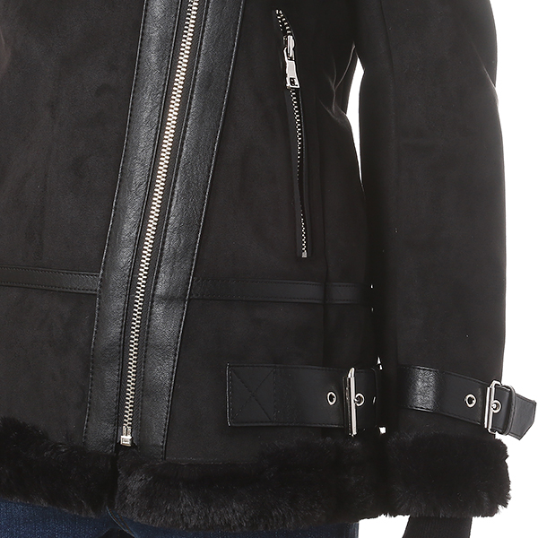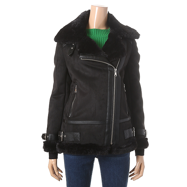 블랙 색상의 트렌디하며 세련된 분위기가 돋보이는 무스탕 자켓 입니다. 벨티드 장식으로 스타일리시한 느낌을 더해줍니다.