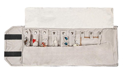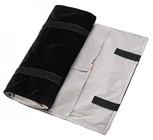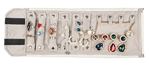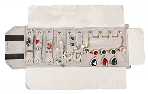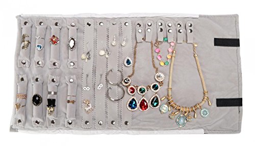 -. Feature : Unfold size: 21.25 ''L x 11.41''W, Foldable size: 11.41''L x 6.29''W, slides easily in and out of your carry-on case or lage, won't take too much room. / Made of soft and suede velvet, nice and smooth to the touch, offer the best protection to all your jewelries. / 6 snaps hangers for storing the necklaces, and a bottom pocket to protect the pendants from damage. / Removable earring strap designed for 20 pair of earrings, enough for a long trip. / The velvet roll features a ring display so you can easily find your favorite finger accessory, and a bottom zipper pocket for your bracelet.