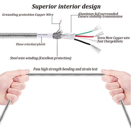 Gold-Plated Connectors (Superior electrical conductivity and antioxidant), and Braided Nylon Tangle-Free USB Cable with Aluminum Connector Can Bear 5000+ Bending Test. Not only have superior quality, but also have a Luxury appearance