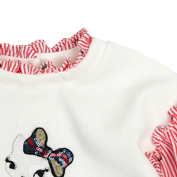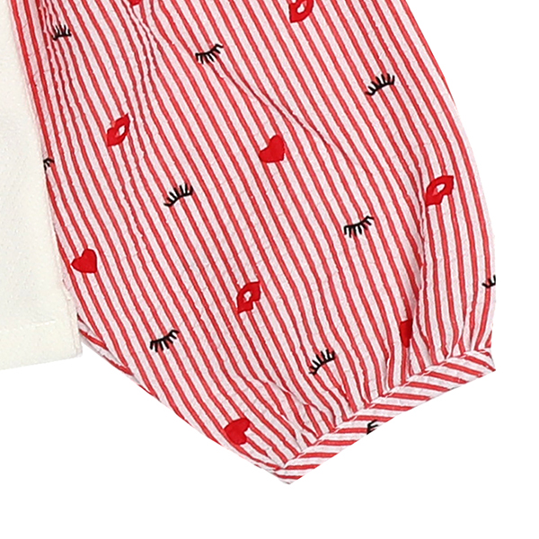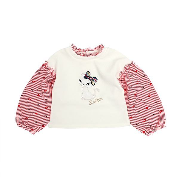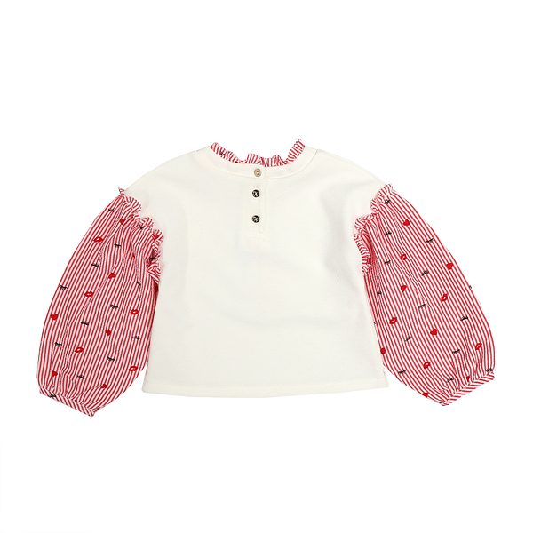 상품설명 소매가 레드 스트라이프가 배색이 되어있는 탑입니다. 소매에 블라우스 같은 느낌과 함께 프릴셔링이 잡혀있어 러블리함을 더했습니다. 데님 팬츠 또는 옐로우 체크치랭스와 코디하시면 셋트로 입히실수 있습니다.