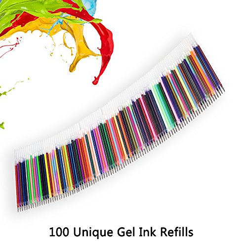 - 100 Unique Colors Gel Pens: Including 28 Glitter, 18 Metallic, 16 Neon, 15 Pastel, 14 Neon-Glitter, 6 Swirl, 3 Classic, 100 free refills. We know that Gel ink runs more quick than usual pens, So we bring more 20% ink in our pens and extra refill inks for you.