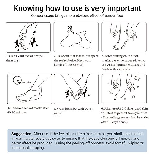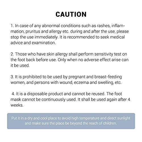 EFFECTS: Baby-soft feet after just 1 application!reduces calluses and cracked heels with one application,removes unwanted dead skin from your feet,no cutting,no scrubbing,easy to use Directions for use: It is recommended to remove all other products such as nail polish on the foot before applying this product. 1. Clean your feet and wipe them dry 2. Take out foot masks, cut apart the seals.Notice: Keep your hands off the essence 3. After putting on the foot masks, paste the paper sticker at the wrists (you can walk around freely with socks on) 4. Remove the foot masks after 60-90 minutes 5. Wash both feet with warm water 6. After use for 3-7 days, dead skin will start to peel off from your feet. (The peeling process shall be ended after 10 days of use) Suggestion: After use, if the feet skin suffers from strains, you shall soak the feet in warm water every day so as to ensure that the dead skin peel off quickly and better effect be produced. During the peeling-off process, avoid forceful wiping or intentional stripping. Precautions: 1. In case of any abnormal conditions such as rashes, inflammation, pruritus and allergy etc. during and after the use, please stop the use immediately. It is recommended to seek medical advice and examination. 2. Those who have skin allergy shall perform sensitivity test on the foot back before use. Only when no adverse effect arise can it be used. 3. It is prohibited to be used by pregnant and breast-feeding women, and persons with wound, eczema and swelling, etc. 4. It is a disposable product and cannot be reused. The foot mask cannot be continuously used. It shall be used again after 4 weeks. Method of storage: Put it in a dry and cool place to avoid high temperature and direct sunlight and make sure the place be beyond the reach of children. 0 |