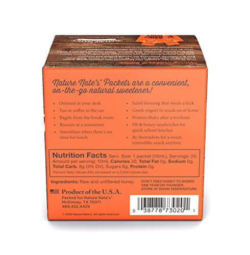 -. Feature : Each packet contains 10 ml of nature Nate's honey (total of 200 ml) / Convenient packets great for lunch boxes, backpacks, gym bags, etc. / Natures Nate's honey is 100 percent pure raw and unfiltered, meaning natural pollens and enzymes / Made by American bees