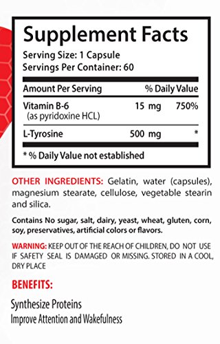 Studio : Healthy Supplements LLC Publisher : Healthy Supplements LLC Binding : Health and Beauty Product Description brain and memory supplements - L Tyrosine 500MG - l tyrosine bulk - 2 Bottles (120 Capsules) STRESS KILLER: L-Tyrosine and Vitamin B-6 both work together for the overall well being and helps with managing your stress levels. When you are regularly in stressful situations L-Tyrosine is usually low if not depleted. Another important benefit of l-tyrosine is elevating the mood and promoting a calm feeling. Vitamin B6 can help the body manufacture neurotransmitters, such as serotonin, and aids in coping with stress. MENTAL CLARITY: Several studies show that tyrosine may improve mental performance under stressful conditions, such as military training, cold-induced stress, or noise-induces stress. The supplementation of L-Tyrosine may also improve mental clarity. EMOTIONAL MANAGEMENT SUPPORT: Emotional health is very important for overall well-being. It is worth noting that studies usually find that vitamin B6 improved mood and emotions especially in stressful situations. L-tyrosine also works to make you feel calmer and promotes elevating your mood. MEMORY SUPPORT: Tyrosine supplements also may improve mental function and memory, as well as relieve fatigue, in sleep-deprived persons, according to the Swedish Medical Center. Some research with tyrosine supplements indicates that they improve memory and cognitive performance. These individuals showed better performance on a memory and a tracking task than a group taking a placebo. 0