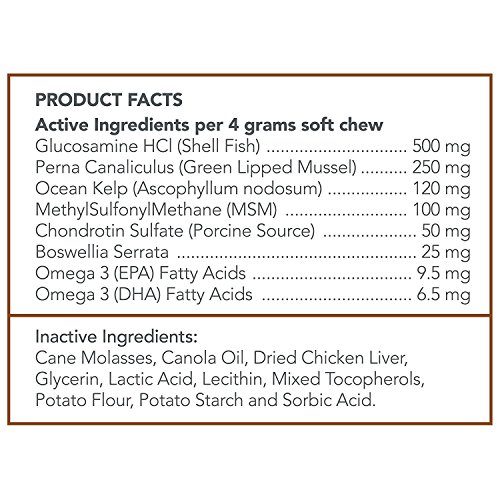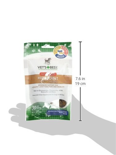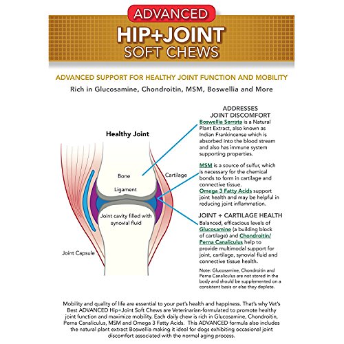 (3 Pack) Vet's Best Advanced Hip & Joint Soft Chews Dog Supplements, Each a 30 Day Supply. Vet's Best Advanced Hip + Joint Soft Chews (30ct) provide a simple, easy and delicious Once-A-Day Hip and Joint supplement to help ensure the mobility and quality of life for your dog. Each Advanced Hip + Joint Soft Chew is Veterinarian-formulated to promote healthy joint function and maximize your dog's mobility. Each daily Hip and Joint soft chew is rich in Glucosamine, Chondroitin, Perna Canaliculus (Green-Lipped Mussel), MSM and Omega 3 Fatty Acids. Vet's Best Advanced Hip + Joint Soft Chews include Boswellia, making them ideal for dogs exhibiting occasional joint discomfort associated with the normal aging process. Made with OptiLife3* Formula containing natural Ocean Kelp which provides Antioxidants to help reduce the effects of normal environmental stress and to help support a healthy immune system along with Prebiotics for digestion and ingredient uptake. Vet's Best Soft Chew Supplements are extra moist, made with vet-quality, natural ingredients, great tasting and have efficacious formulations with a high level of bioavailability for optimal absorption.Feature