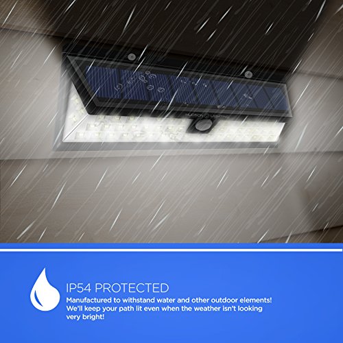 - 500 LUMENS OF LED LIGHTING– Every outdoor wireless motion-sensing, solar-powered LED light is fitted with 54 powerful LED lights that offer precision clarity in low, dark or night lights so you can move with confidence outside. When comparing less expensive led technology be sure to compare the lumens!