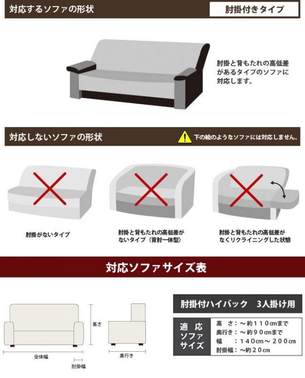 | 仕様 | 抗菌防臭加工(SEKマーク取得) ウォッシャブル(洗濯機洗い可能・ネット使用) 【適応ソファーサイズ】 高さ:~約110cmまで 奥行き:~約90cmまで 幅:140~200cm 肘掛幅:~約20cm |