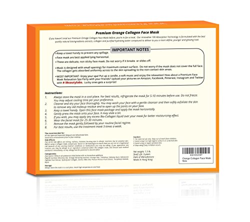 -. Feature : IMPRESS WITH YOUR RADIANT, GLOWING SKIN: Every woman who respects herself trusts nothing less than highest quality cosmetic products. If you have been looking for the ultimate facial care mask, you have come to the right place! This orange collagen mask is all you need to deeply cleanse and nourish your skin. The thick, steady, easy to use face mask will allow your complexion to absorb collagen and fight aging! If you want to stay young and impress, your quest stops here! / ERASE BLEMISHES AND LOOK REFRESHED AND REJUVENATED: This facial skin therapy orange collagen mask can deeply moisturize your complexion, expel toxins and make your skin smooth. What is more, it can help you reduce wrinkles and aging signs, treat acne, erase spots and blemishes, treat blackheads and acquire a beautiful face. Are you ready to make some heads turn? / PROFESSIONAL BEAUTY CARE AT THE COMFORT OF YOUR OWN HOME: This pure collagen skin care facial mask can be used by beauty experts, professionals and women who like to take proper care of themselves. The high quality and the low cost give you the chance to indulge yourself to the professional beauty care at the comfort of your own home, eliminating the need to waste money on beauty salon visits once and for all! / THE PERFECT GIFT FOR EVERY WOMAN: No matter what your age or your skin type is, this facial treatment mask is ideal for you! Apart from making it yours, you can also offer it as a gift to a friend, a family member or a colleague. In addition, the pack of 5 allows you to organize a gathering and spend the afternoon with your closet friends, taking care of yourselves and relaxing. Nothing less than you deserve! / 100% RISK FREE PURCHASE: Keeping you satisfied and providing you with the friendliest customer service is our number one goal. This is why we stand 100% behind our products, offering you a 60 days money back guarantee and assuring you that making this orange collagen facial mask yours is entirely risk free.