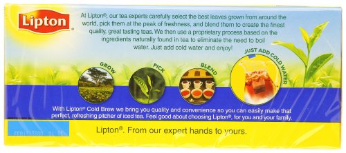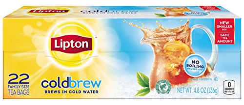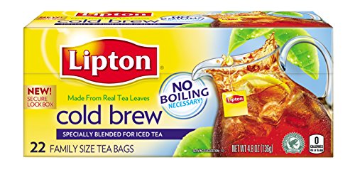 -. Binding : Grocery -. Brand : Lipton -. EAN : 0041000090035 -. Feature : Case of twelve 22-teabag boxes (264 total teabags) / Pitcher (family) size tea bags, brews with cold water in 5 minutes / 100% natural tea (Contains Orange Pekoe and Pekoe cut black tea) / Freshly brewed iced tea when you want it. / Brews in cold water so that you get freshly brewed pitcher sized tea in minutes / Pack of twelve 22-count family size tea bag boxes (total 264 tea bags) / 100% natural, no preservatives or coloring / LIPTON® orange pekoe and pekoe cut black tea is the perfect blend for a perfect cup of tea / Enjoy a refreshing pitcher of tea in less than five minutes, without hot water -. IsAdultProduct : 0 -. Label : Lipton -. Manufacturer : Lipton -. Model : 4100009003 -. MPN : 09003 -. NumberOfItems : 12 -. PackageQuantity : 12 -. PartNumber : 09003 -. ProductGroup : Grocery -. ProductTypeName : GROCERY -. Publisher : Lipton -. ReleaseDate : 2006-07-27 -. Size : Package size of 4.8 oz -. Studio : Lipton -. Title : Lipton Iced Tea, Cold Brew Cup Family Size 22 Count (Pack of 12) -. UPC : 041000090035