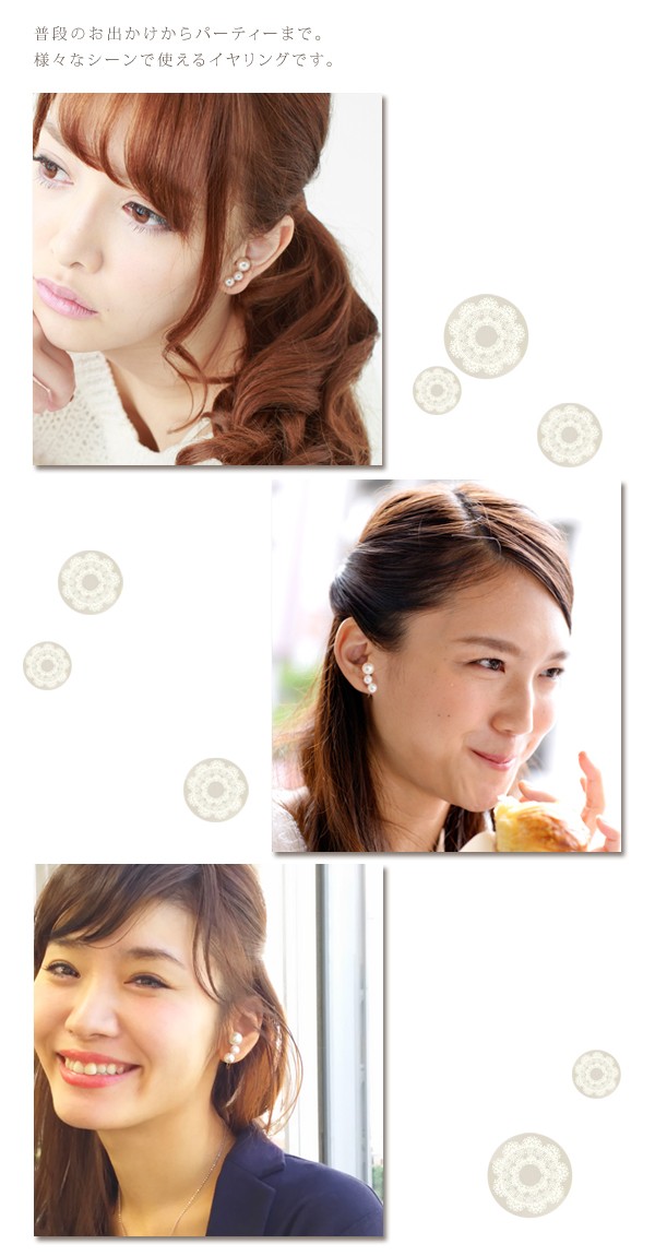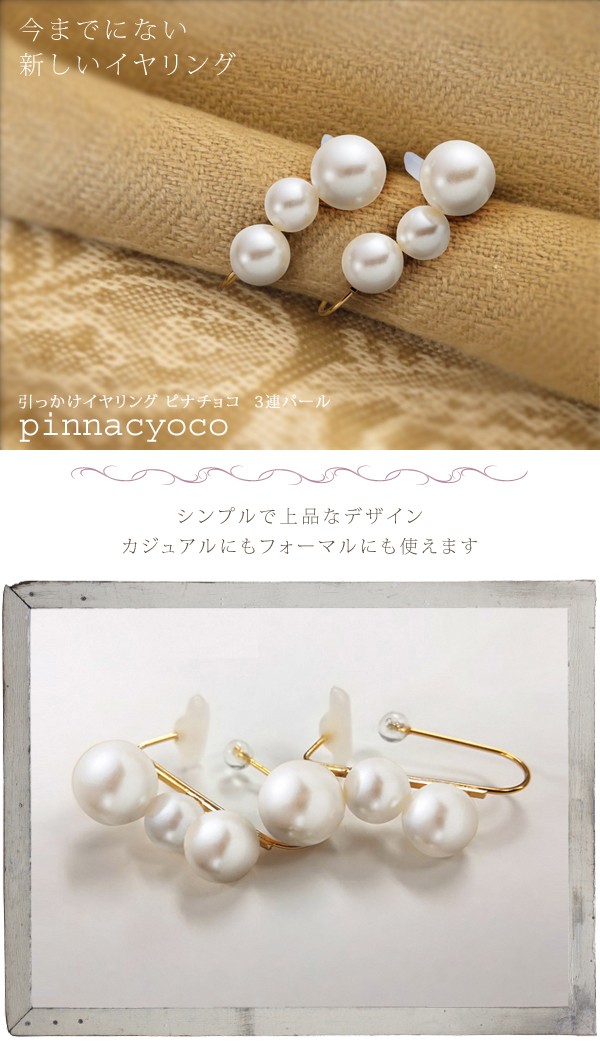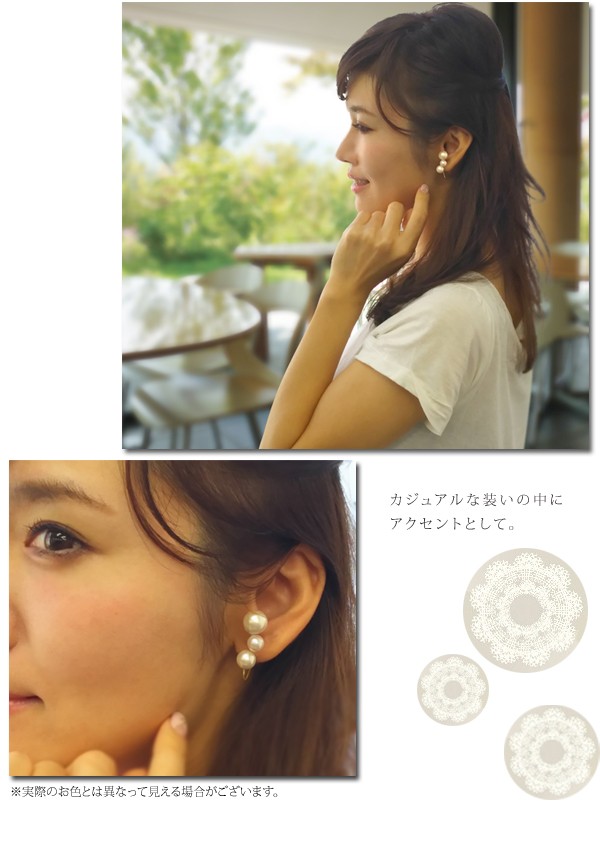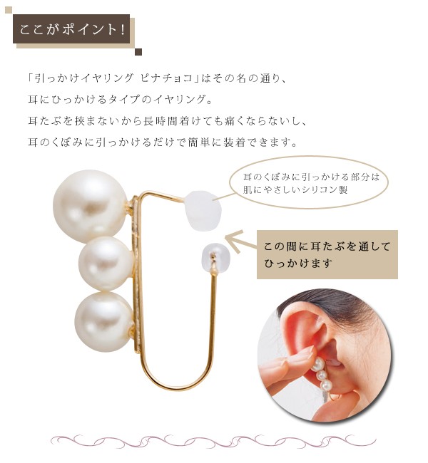 | <h1>従来のイヤリングは耳たぶを挟む形状がですが、この商品はクリップ状になっており、耳のくぼみに引っかけて使用します。長時間の着用でも痛くなりにくく、シリコン部が耳のくぼみにフィットするため、落ちにくくなっています。イヤリング/ピアス/アクセサリー/痛くない/挟まない/落ちない/フック/シリコン/パール/3連/ゴールド/パーティー/冠婚葬祭/フォーマル/結婚式/入学式/卒業式/シンプル/大きめ/大ぶり</h1> |