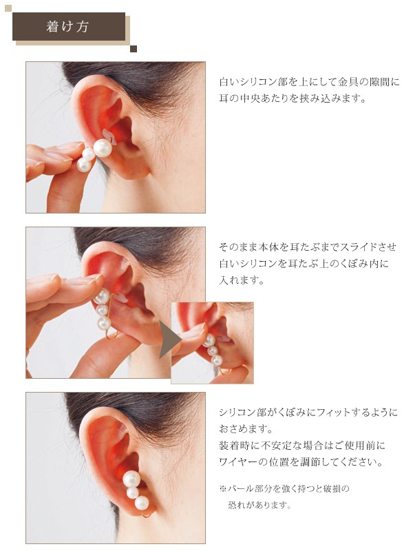 | 従来のイヤリングは耳たぶを挟む形状がですが、この商品はクリップ状になっており、耳のくぼみに引っかけて使用します。長時間の着用でも痛くなりにくく、シリコン部が耳のくぼみにフィットするため、落ちにくくなっています。 |