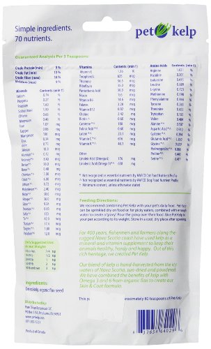 -. Binding : Misc. -. Brand : Pet Kelp -. Feature : Minerals And Vitamins From Kelp Combined With Omegas From Organic Flax Seed -. Label : Pet Kelp -. Manufacturer : Pet Kelp -. PackageQuantity : 1 -. ProductGroup : Pet Products -. ProductTypeName : PET_SUPPLIES -. Publisher : Pet Kelp -. Studio : Pet Kelp -. Title : Pet Kelp Skin and Coat Formula