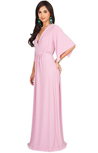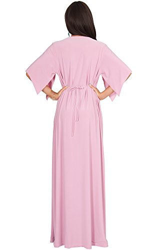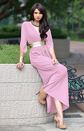 A stunning new caftan styled cocktail maxi dress with sleeves from Koh Koh that is the perfect evening dress. These beautiful designer caftan inspired maxi dresses are featured a v-neck front with half-short sleeves that cover just the top of the arm. The caftan styled cut provides for the perfect fitting as you simply tie the waist bands at the back of the dress to your perfect fit. Due to the position of the high waist-band, the dress has a generous empire waist and can be used as a maternity maxi dress, maternity dress, pregnancy dress or a lovely baby shower dress. The color is Dusty Pink and Petite Size Small / S / 4-6.